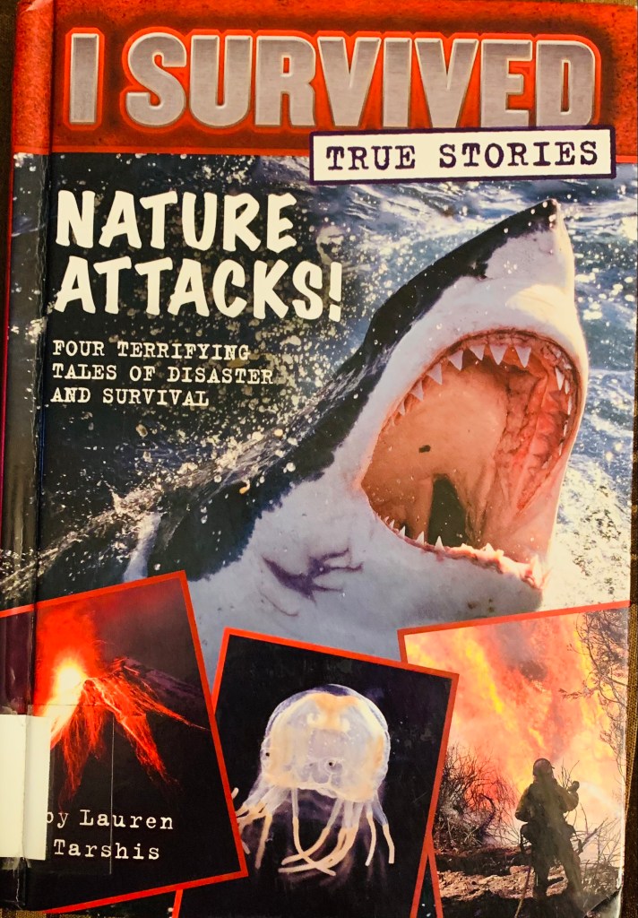 This is a book by Lauren Tarshis. It tells about kids who survived dangerous events, like a girl getting tangled in a box jelly fish, a kid who got bitten by a shark, how a family survived the great Peshtigo fire, also a kid who survived the eruption of Mt. Tambora.